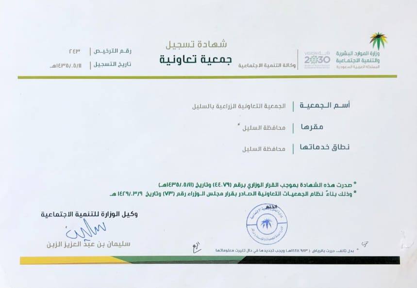 الجمعية التعاونية الزراعية بالسليل – منطقة الرياض مسجلة بوزارة الموارد البشرية والتنمية الاجتماعية برقم 243 بموجب نظام الجمعيات التعاونية الصادر بقرار مجلس الوزراء رقم ( 73 ) وتاريخ 9-3-1429 هـ وبناء على قرار الوزارة رقم (44079) وتاريخ 11-5-1435 هـ